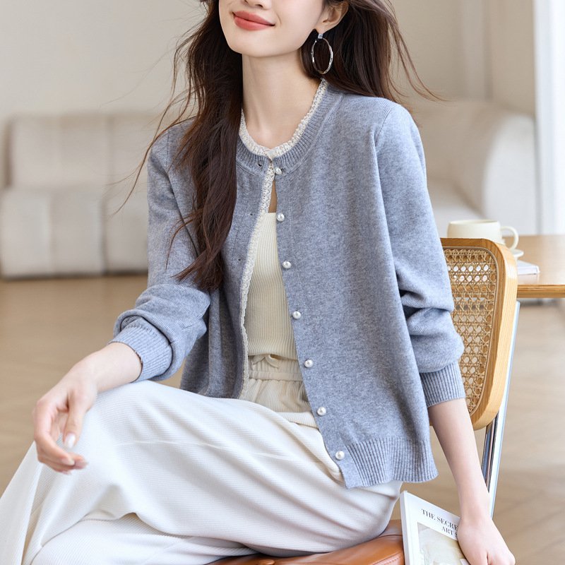 여성 그레이 니트 가디건 아우터 무드 상의 레이스 긴팔 니트